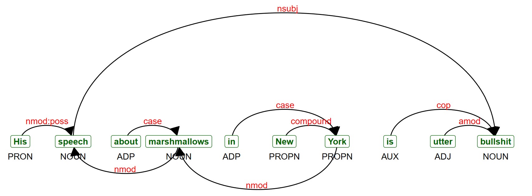 This example visualises the result of a text annotation which provides parts of speech tags and dependency relationships.